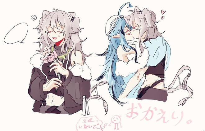 Ah this one is so cute ( />/~/</)…I don’t usually like vtuber ship art because it’s a bit yucky to pry into their private lives like that but this one…so good…I love involuntary tail wagging, like when a character sees their favorite person or gets a really unexpected hug and their tail just starts going crazy? Yeah…